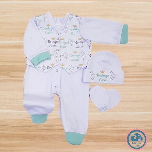 São quatro itens que deixaram seu príncipe mais lindo ainda com um toque de luxo e personalização. O Colete é personalizado com o nome do bebê, com abertura frontal e botões de pressão.